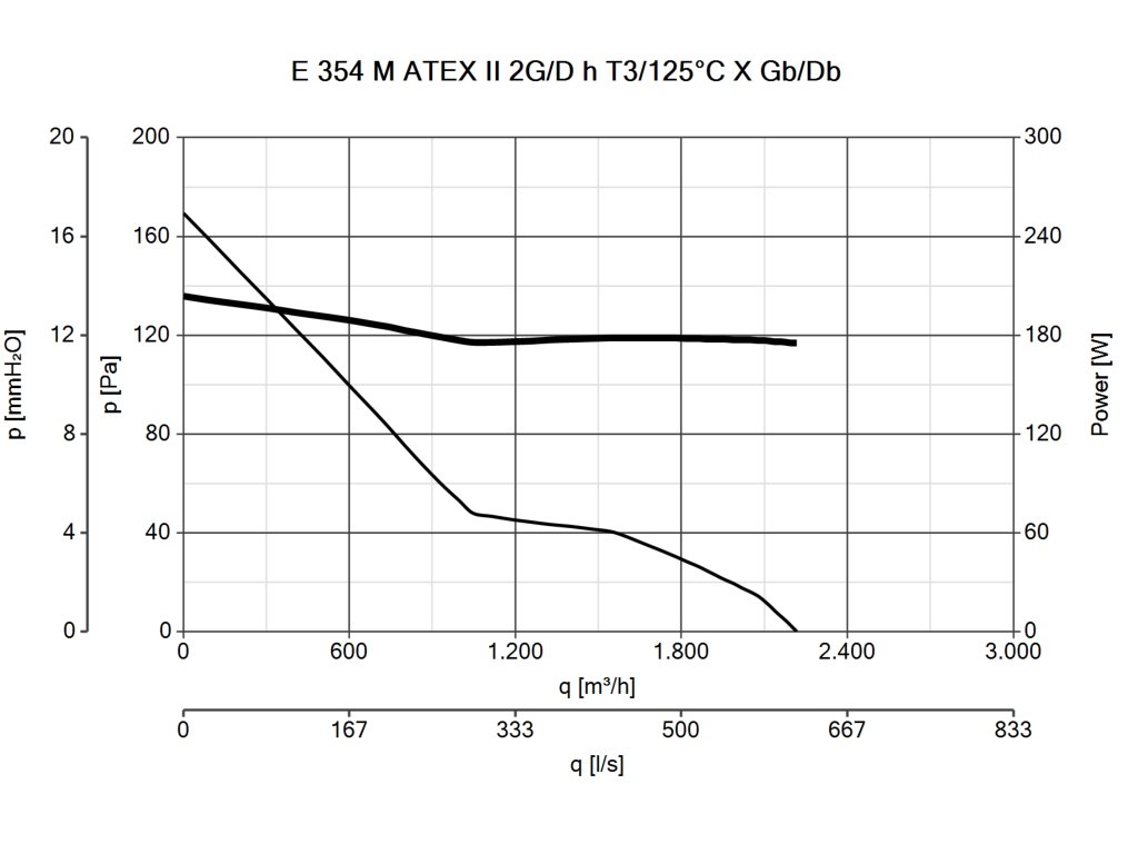 jednofázový axiální ventilátor Italského výrobce Vortice E ATEX s kódovým označením E 354 M ATEX II 2G/D H T3/125°C X GB/DB určený do prostorů, kde hrozí nebezpečí výbuchu plynů, nebo prachových částic. Ventilátor s přímým výfukem určený pro montáž do stěny, stropu nebo také do kruhového potrubí.