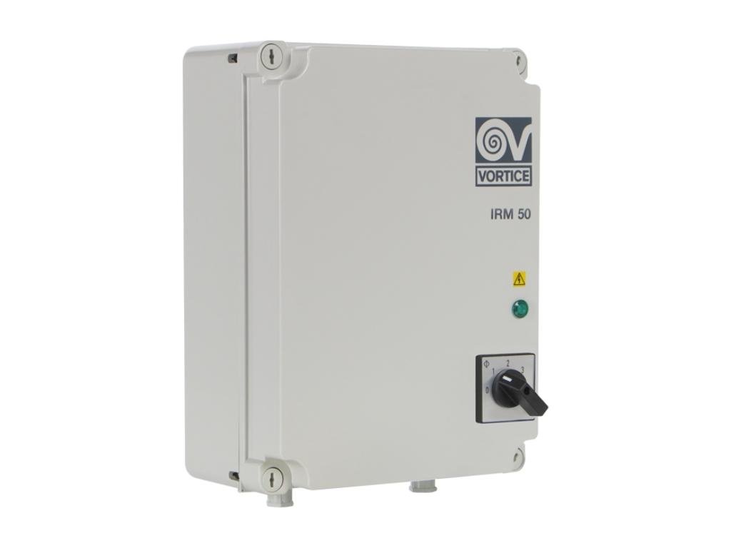 Třístupňový regulátor otáček Vortice IRM 50 určený pro jednofázové průmyslové ventilátory. Přepínač 0/1/2/3. Maximální zátěž 4,8 A