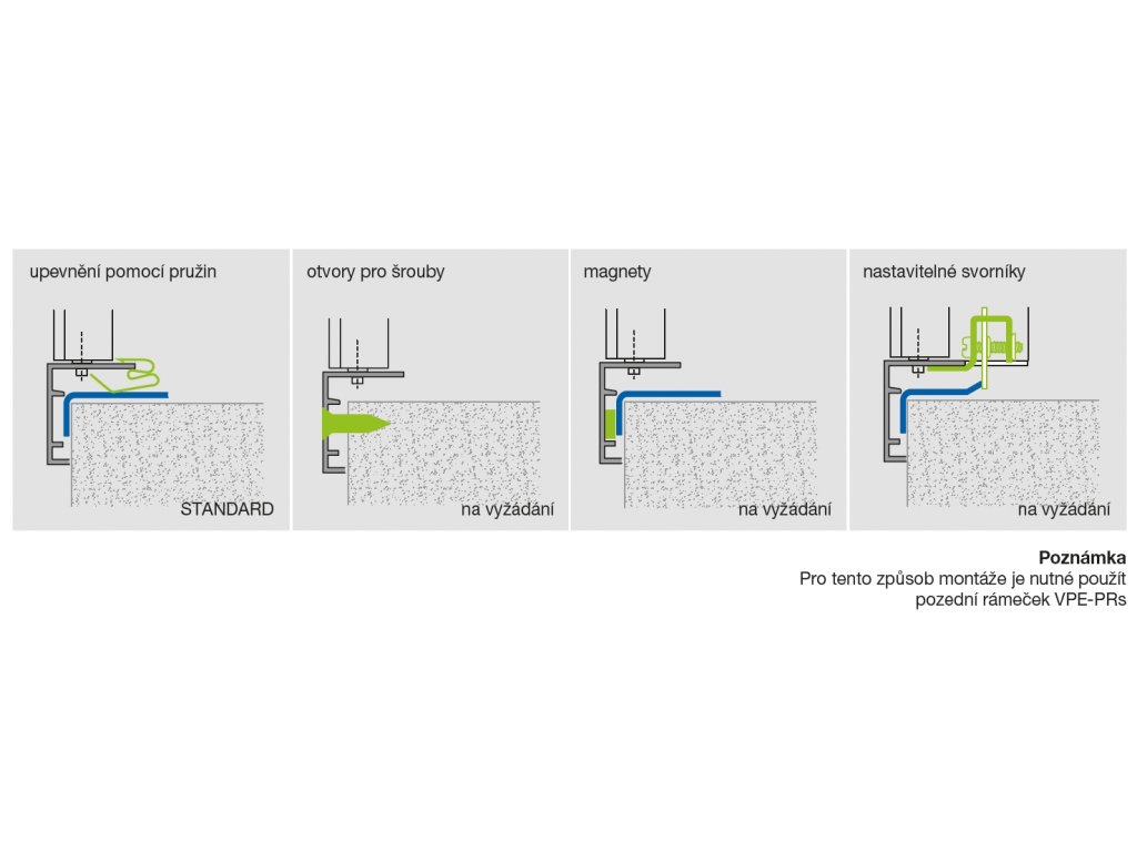 standardně dle montážních pružin. Na přání mřížky s předvrtanými otvory pro šrouby, upevnění pomocí magnetů nebo nastavitelných svorníků.
