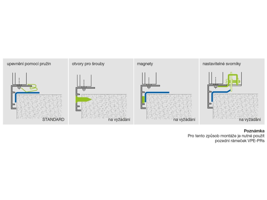 standardně dle montážních pružin. Na přání mřížky s předvrtanými otvory pro šrouby, upevnění pomocí magnetů nebo nastavitelných svorníků.