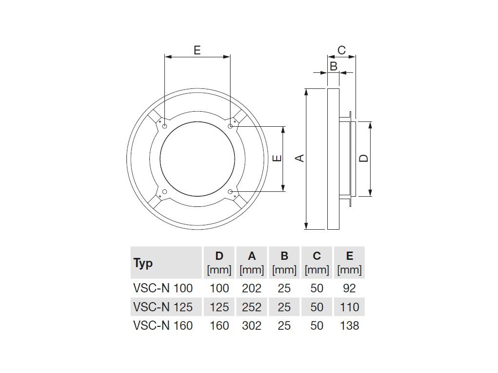 Průchozí stěnový ventil - průměr potrubí ⌀ 100 mm, kruhový, k instalaci přímo na stěnu, neutrální design, s tlumiči hluku, barva bílá (RAL 9010), materiál galvanizovaná ocel, kruhový tvar, rozměry 202 × 202 mm (Š×V), hmotnost ~ 3 kg