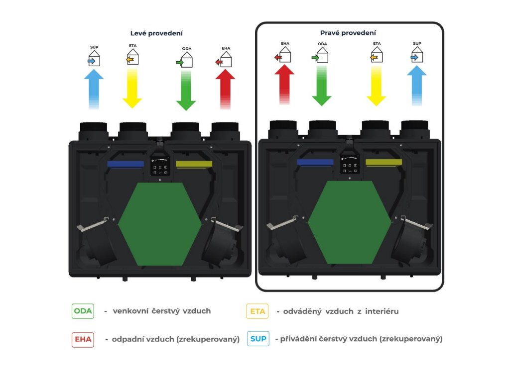 Přívod + odvod vzduchu z interiéru naleznete na pravé straně. Lze zakoupit také ve variantě ze zdířkami na straně levé.