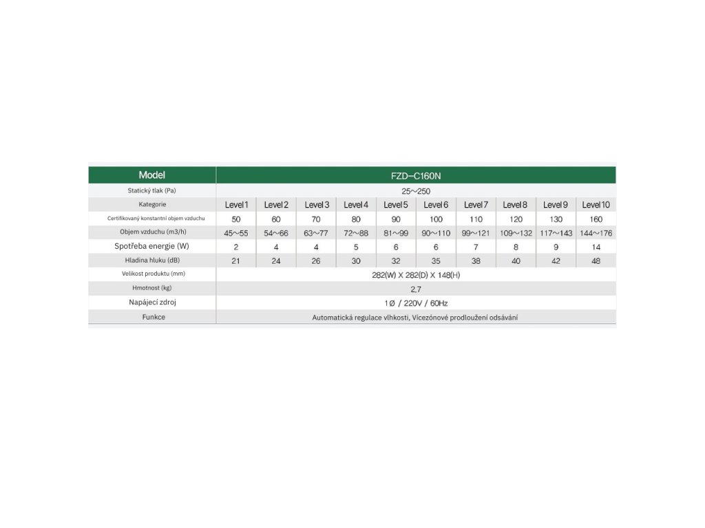 Koupelnový ventilátor - ⌀ 100 mm (průměr potrubí), radiální konstrukce, průtok až 160 m3/h, barva bílá, příkon 2-14 W, režimy (odvětrávání, odvlhčování), motorizovaná klapka, LCD displej, voděodolnost IP X5, 10 rychlostí, lze instalovat do stěny / stropu, dálkové ovládání, nízká hlučnost 21-48 dB/A, konstantní průtok - snadno se přizpůsobí prostředí, statický tlak 25-250 Pa, umístění (do - koupelen / toalet / kuchyní), rozměry 282 × 282 mm (Š×V), hmotnost 2,7 kg